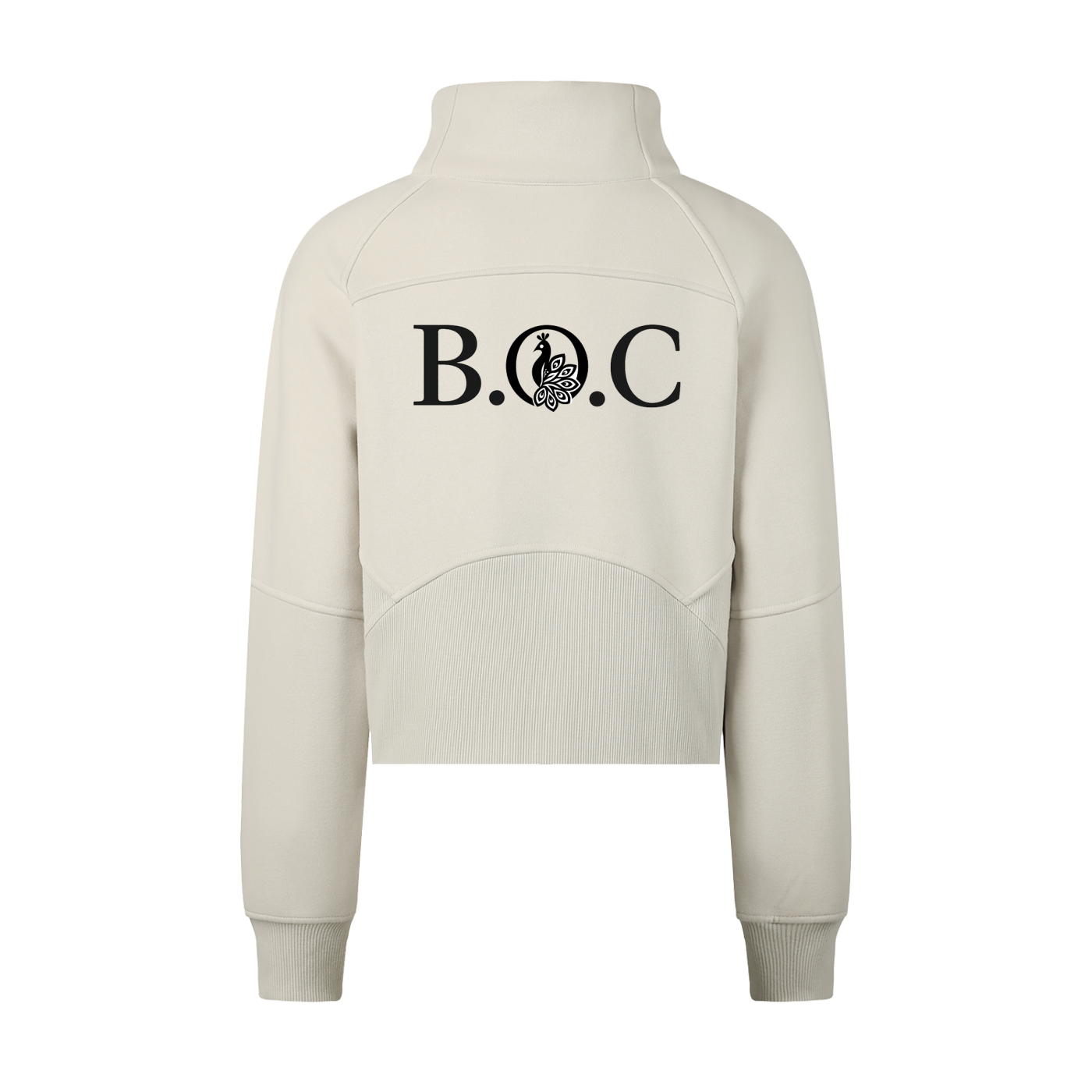 The Limitless Power quarter-zip blends sophistication with strength. Designed in a clean cream finish, it features the B.O.C emblem on the chest and bold back branding that declares your presence from every angle.